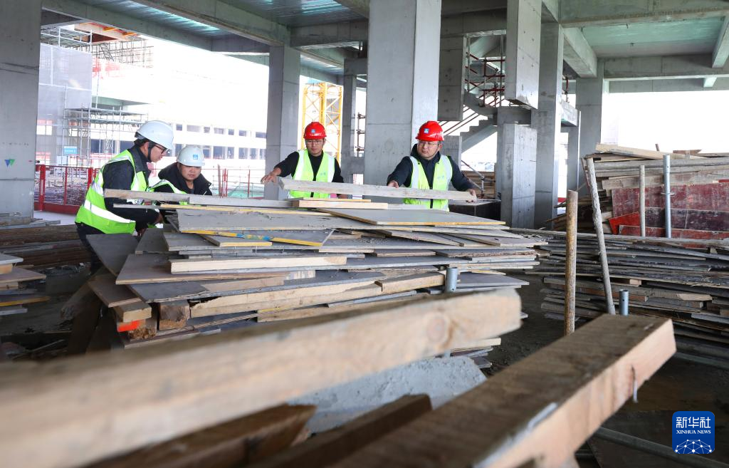 1月30日,在位于上海青浦区的国家医学中心——中山医院青浦新城院区建设工地现场,中建二局工地巡检小队队员们在整理废弃施工物料。
