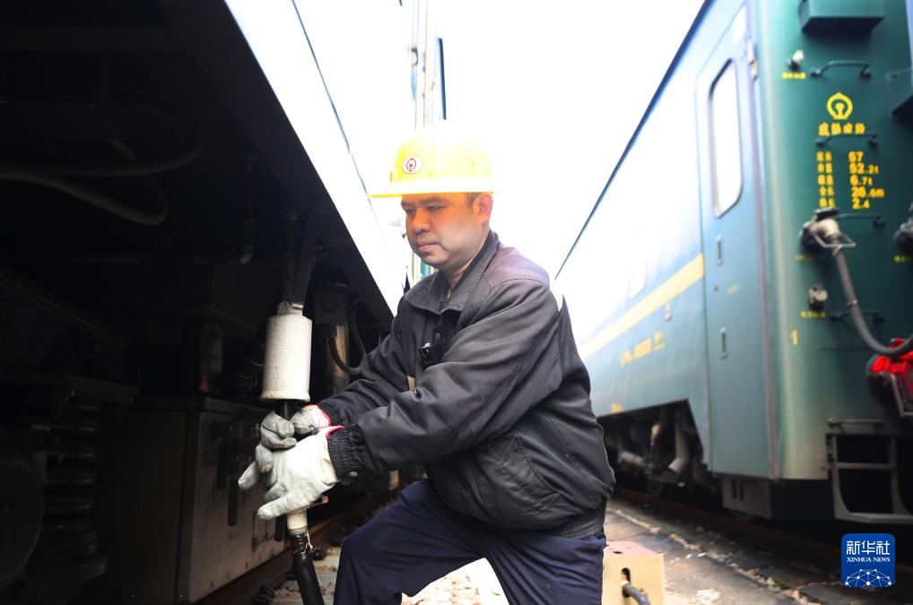 1月30日,在湖南省衡阳火车站,铁路上水员在给列车上水。