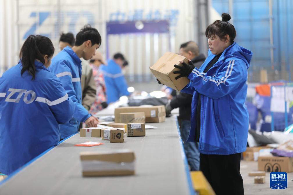 1月30日,在湖南省永州市道县中通快递分拣中心,工人在分拣快递件。