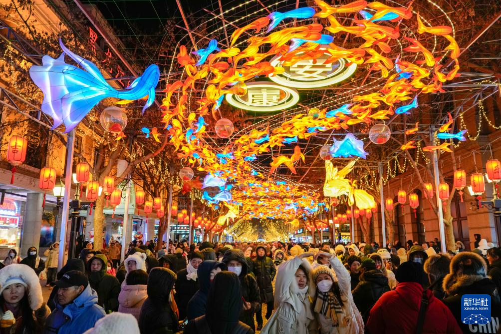 1月30日,游客在哈尔滨中央大街上的亚冬会主题灯饰下游玩、拍照。