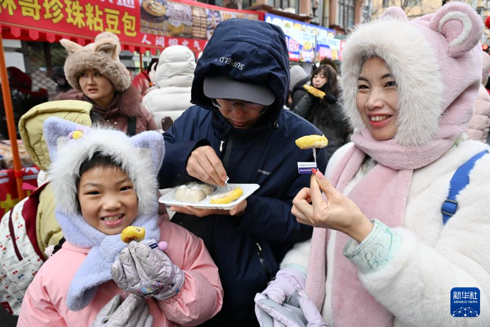 1月28日,在哈尔滨市红专街早市,游客在吃粘豆包。