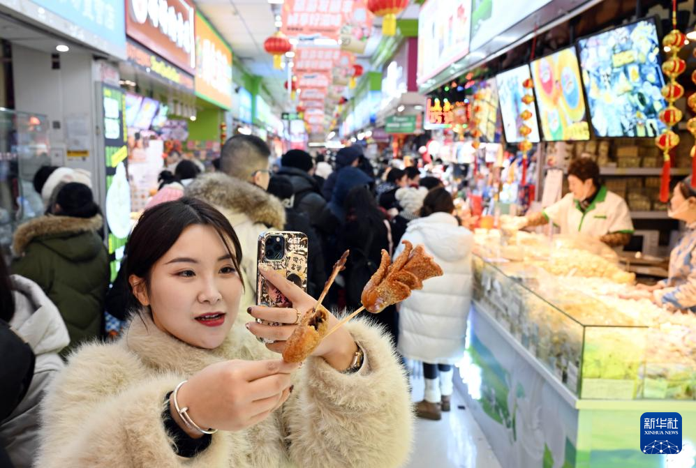 1月29日,在哈尔滨市道里菜市场,游客在给美食拍照。