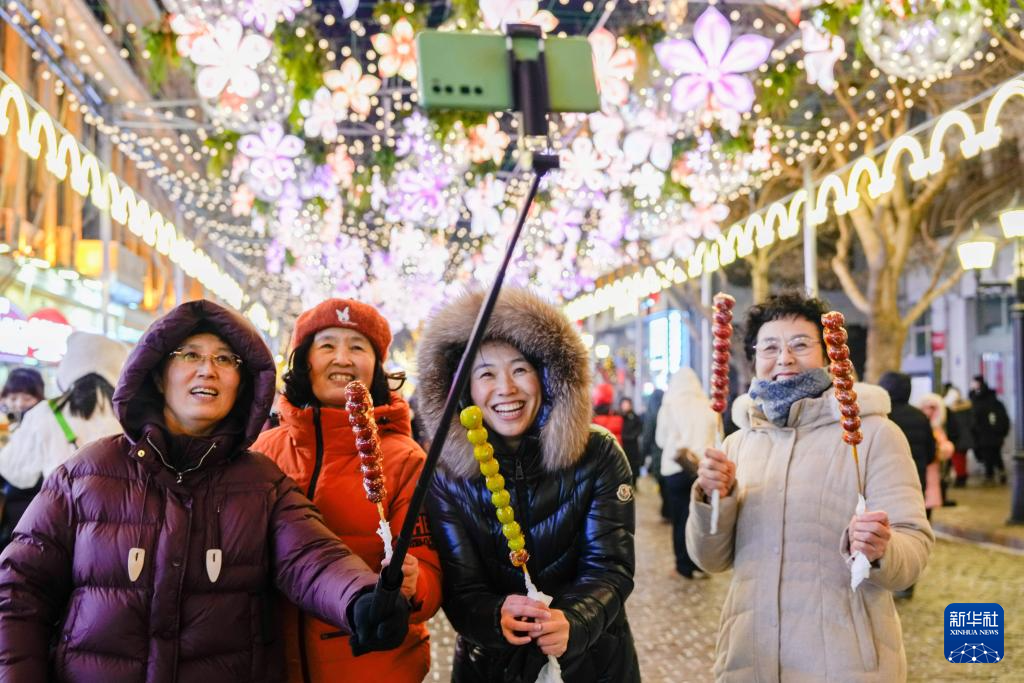 1月30日,游客在哈尔滨中央大街上手持糖葫芦自拍。