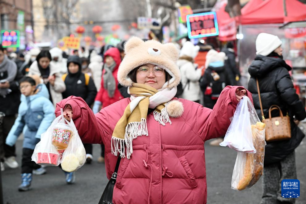 1月28日,在哈尔滨市红专街早市,游客展示购买的美食。