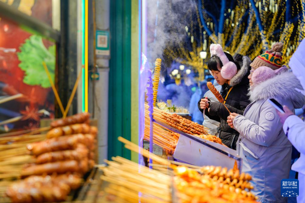 1月30日,游客在哈尔滨中央大街上品尝烤肠。