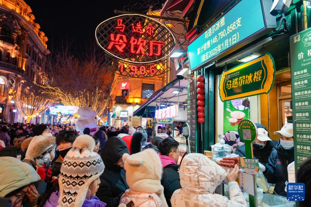 1月30日,游客在哈尔滨中央大街上的马迭尔冷饮厅购买冰棍。