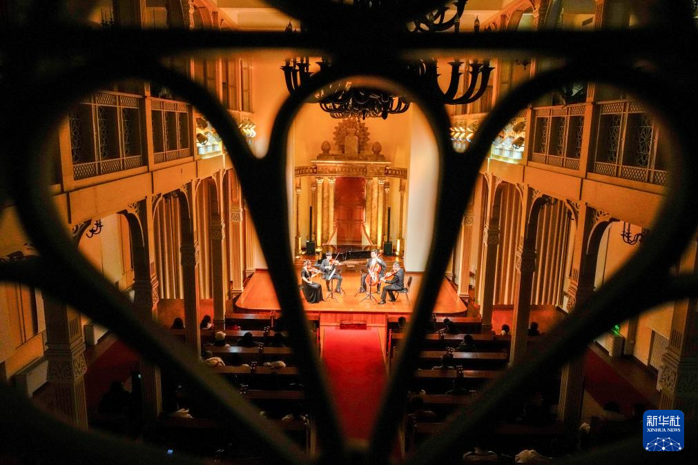 1月30日,游客和市民在哈尔滨老会堂音乐厅欣赏弦乐四重奏《爱的致意》。