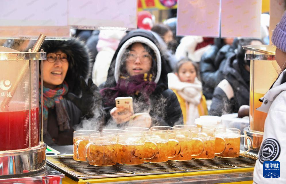 1月28日,在哈尔滨市红专街早市,游客在购买冰糖雪梨。