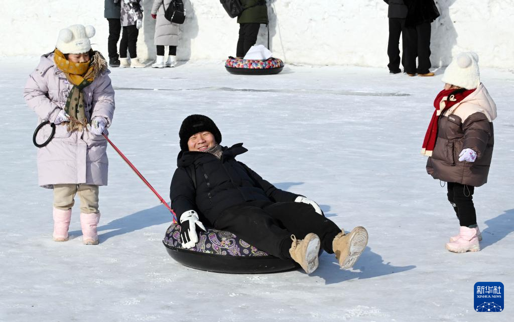 1月30日,在哈尔滨松花江冰雪嘉年华园区,游客在玩雪圈。