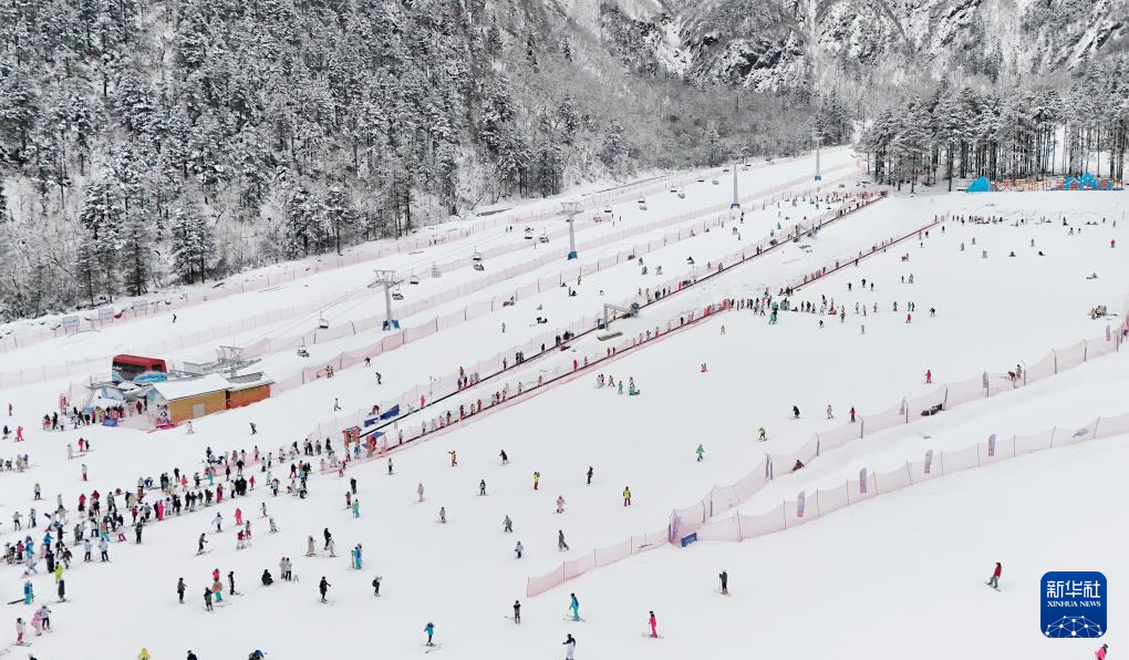 1月31日,游人在羌人谷滑雪场游玩(无人机照片)。