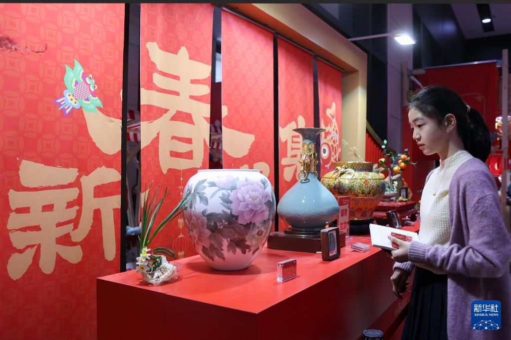 2月1日,观众在北京的中国工艺美术博物馆“过年——春节主题展”上观看瓷器。
