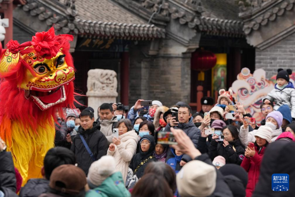 为庆贺蛇年春节,在北京民俗博物馆举行的北京东岳庙庙会上,来自全国各地的七支舞狮队伍为市民游客进行舞狮表演,共贺新春。