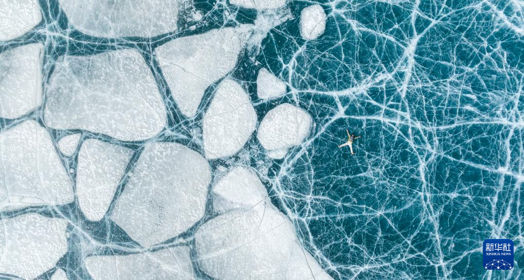 一名游客躺在恰央错结冰的湖面上拍照(1月26日摄,无人机照片)。