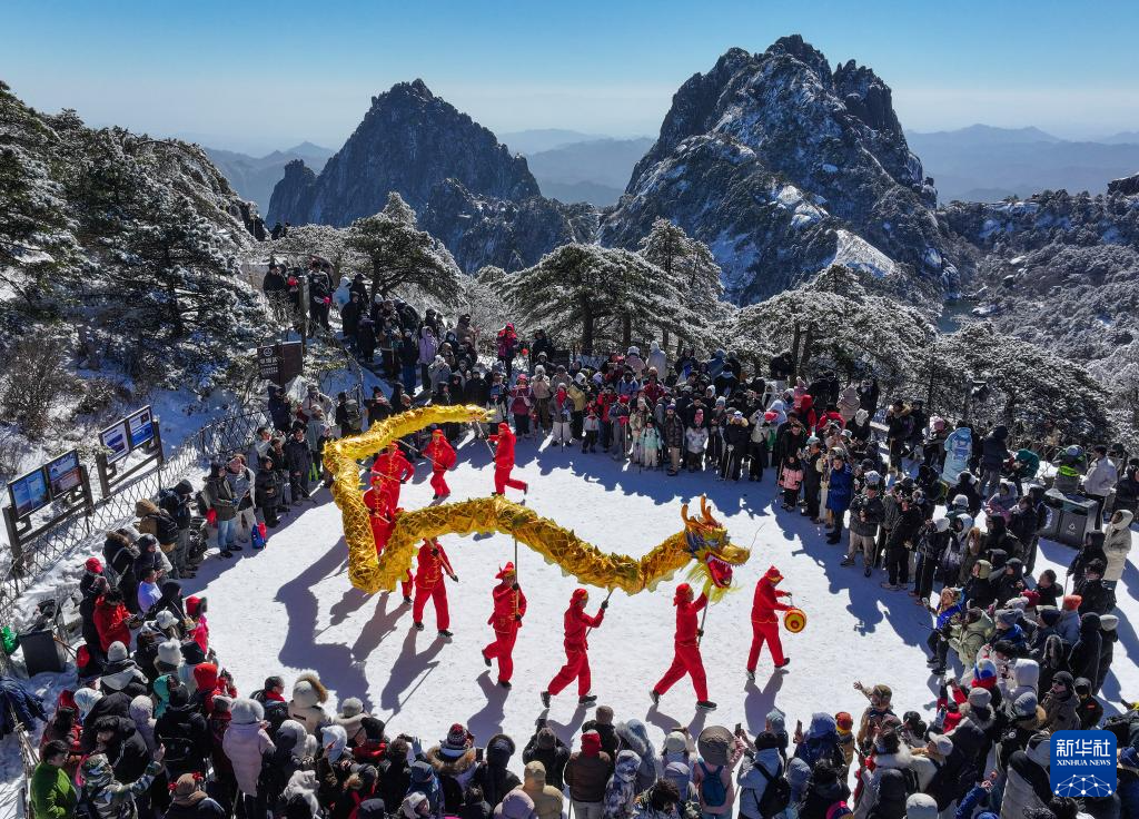 1月27日,民俗舞龙队在雪后的安徽黄山风景区光明顶表演(无人机照片)。