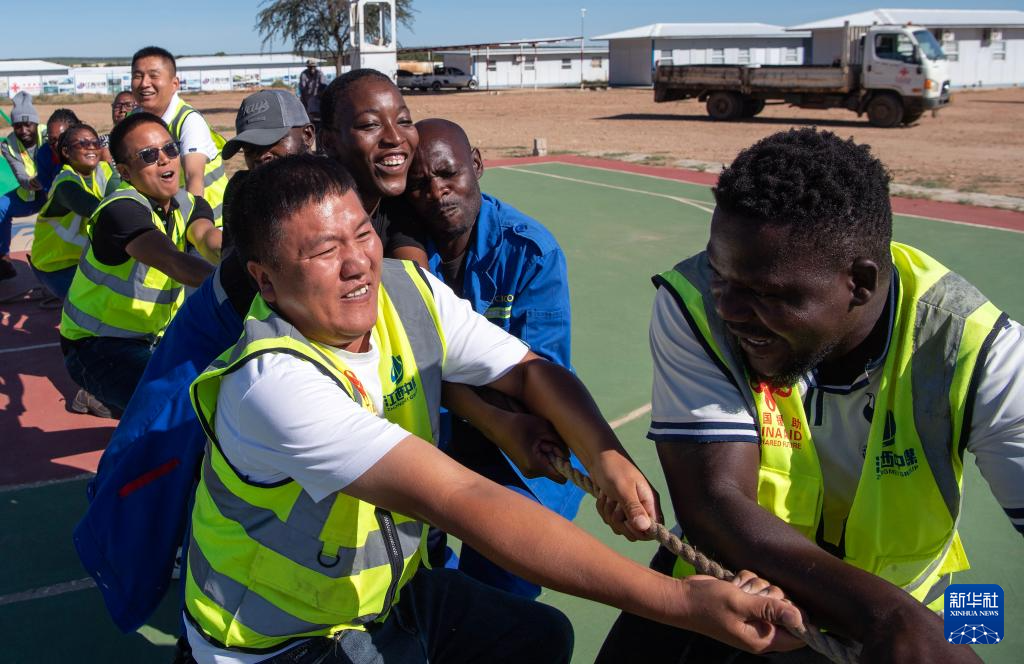 2月1日,在纳米比亚首都国际机场公路项目第三期工程驻地,中纳员工参加拔河比赛。