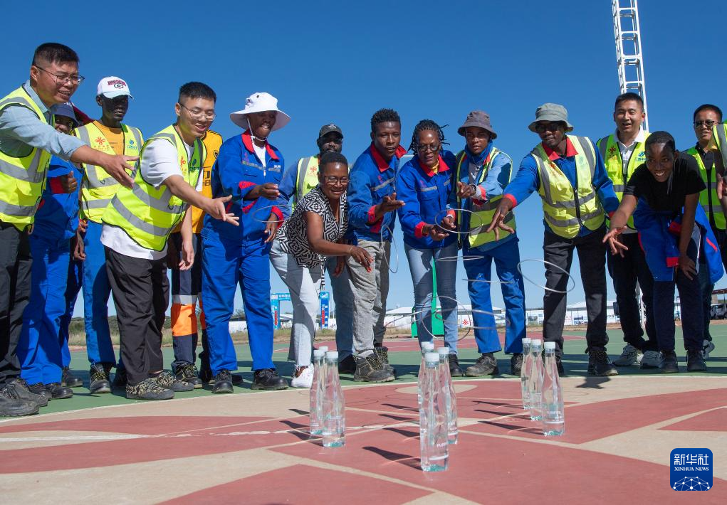 2月1日,在纳米比亚首都国际机场公路项目第三期工程驻地,中纳员工参加套圈游戏。