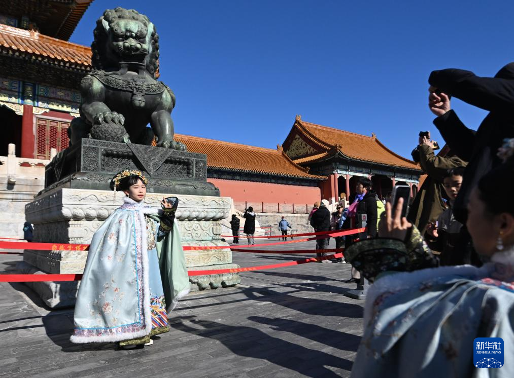 2月2日,小朋友在位于北京中轴线上的故宫拍照留念。