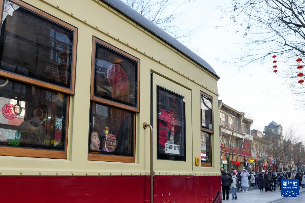1月29日,在位于北京中轴线上的前门大街,游客乘坐“铛铛车”观光游览。