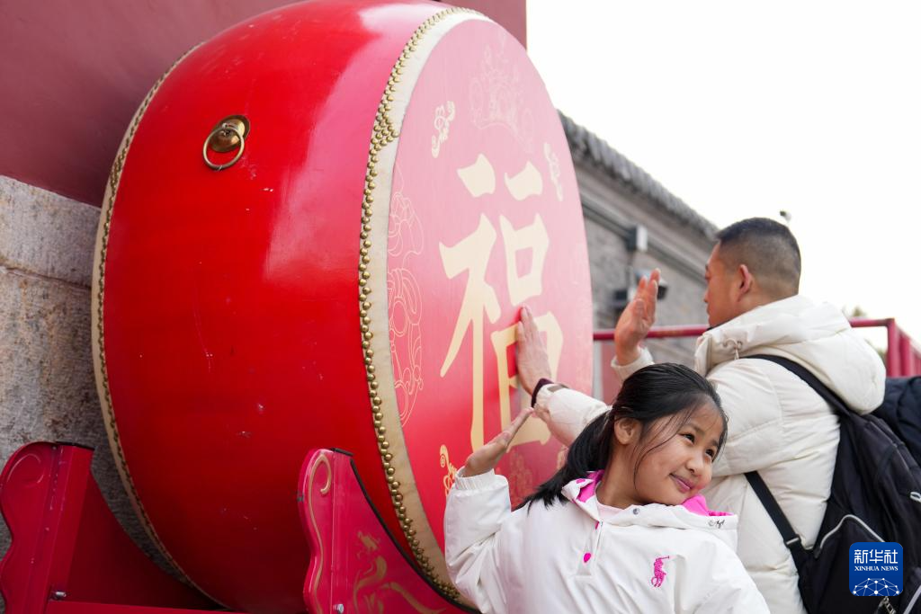 1月31日,小朋友在北京鼓楼下设置的祈福鼓前拍照留念。