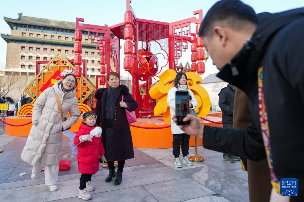 1月29日,在位于北京中轴线上的前门大街,几位游客与新春景观装置合影留念。