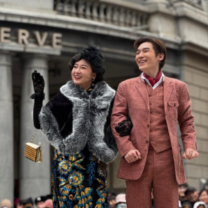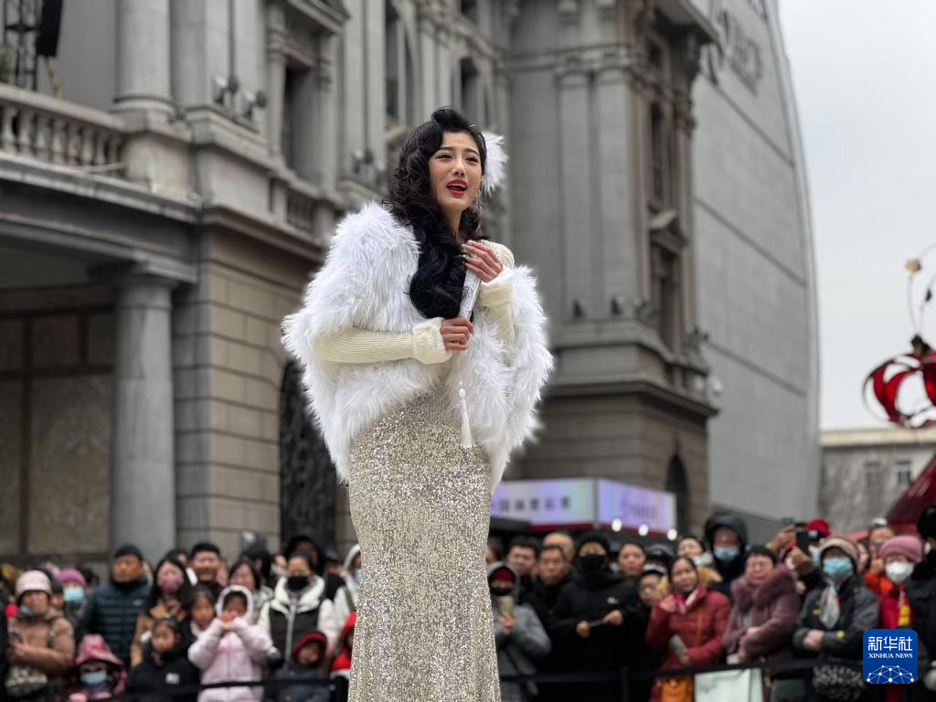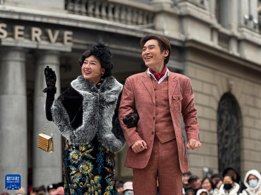 2月1日,演员在天津地标金街商圈大铜钱广场表演经典话剧《日出》片段。