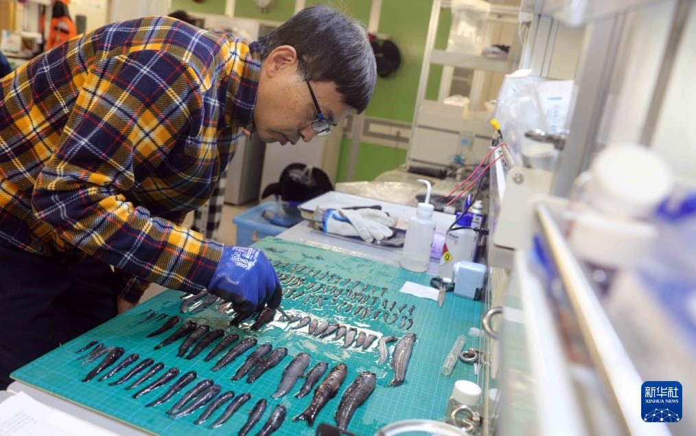 考察队员田永军将拖网打捞上来的鱼进行分类(2月1日摄)。