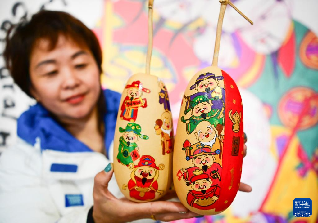 2月2日,游客在山东省聊城市中华水上古城景区展示“五路财神送福”工艺葫芦。