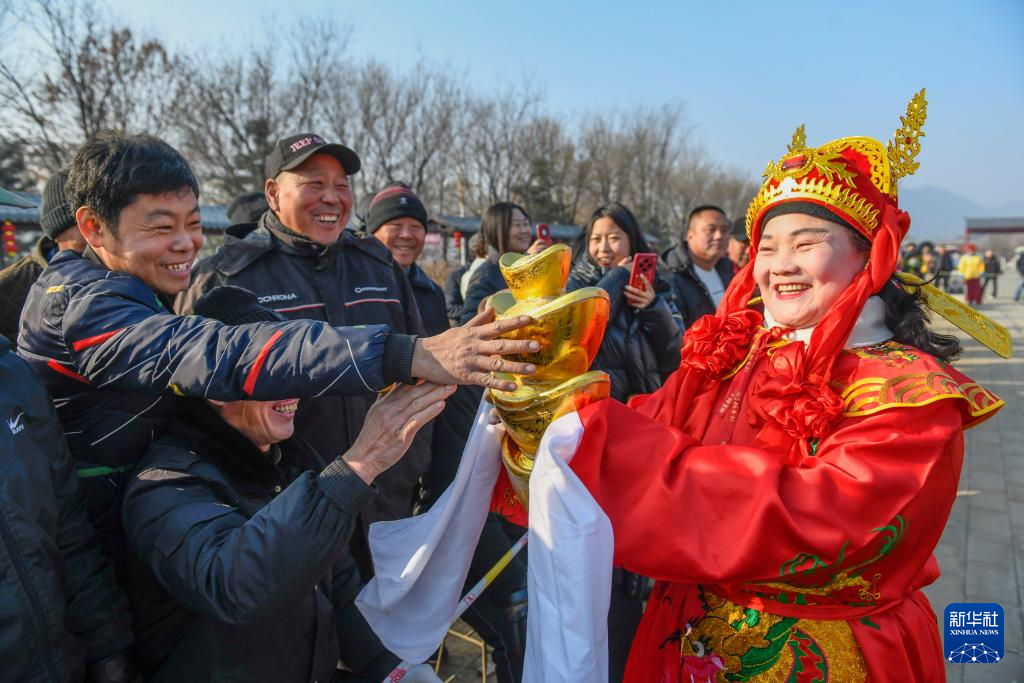 2月2日,“财神”在河北省遵化市一景区和游客互动。