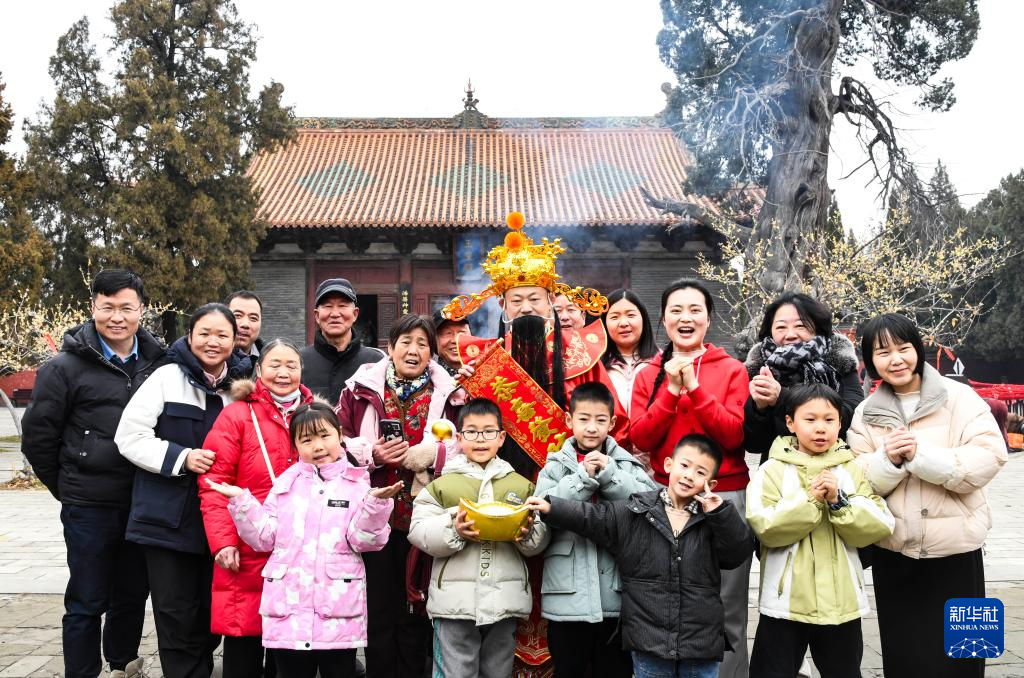 2月2日,游客在河南省济源市济渎庙与“财神”合影。