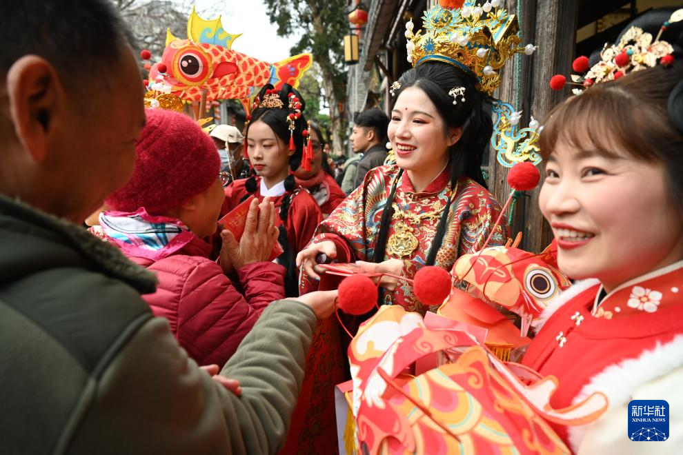 2月2日,“女财神”为福州三坊七巷的游客送上新年祝福。