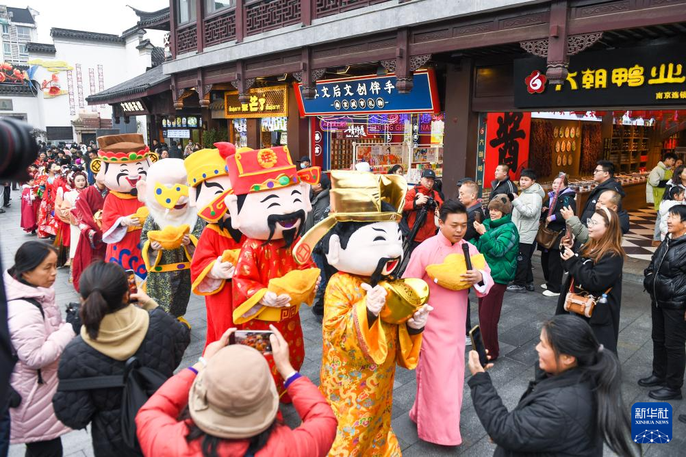 2月2日,“财神”在江苏省南京夫子庙景区向游客送上祝福。