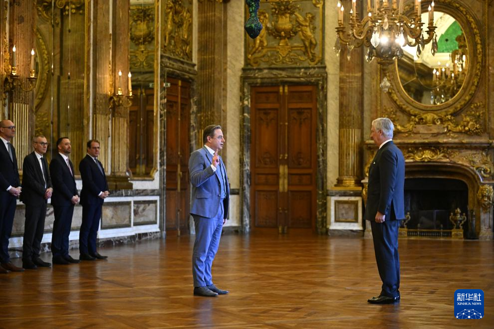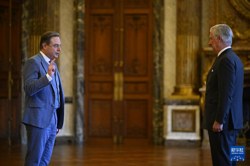 2月3日,比利时新任首相巴尔特·德韦弗(左)在布鲁塞尔王宫宣誓就职。