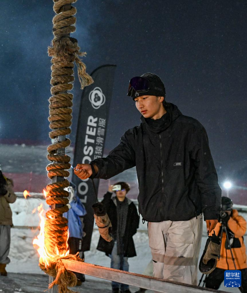 乔木团队成员合勒木别克·哈布肯在新春趣味滑雪公园跳台活动开始前点燃火圈(1月29日摄)。