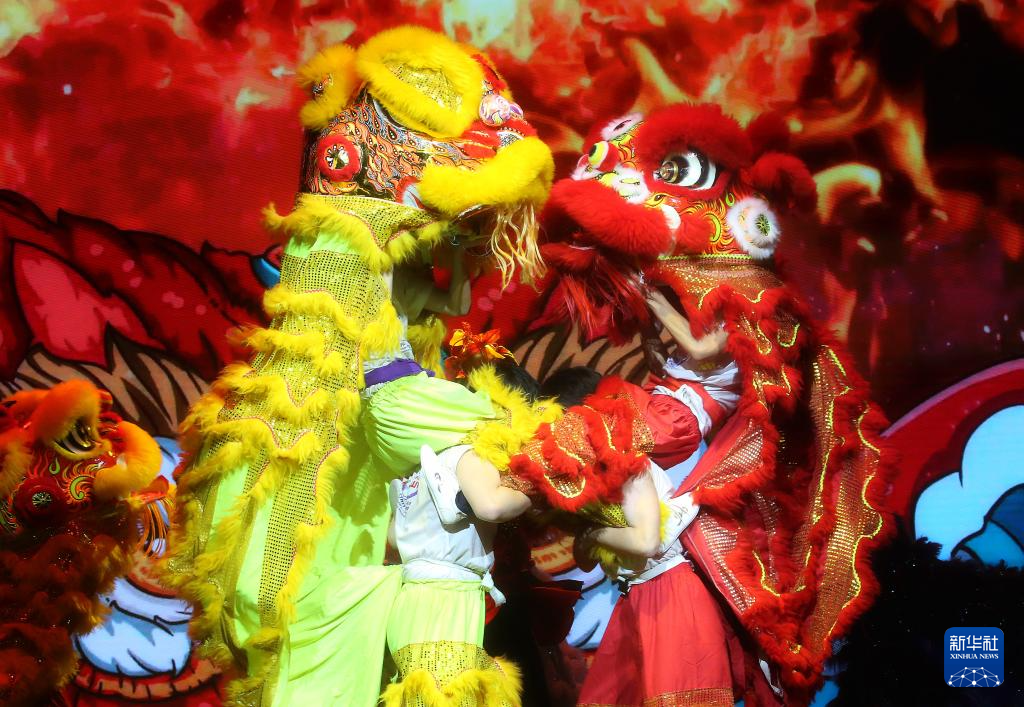 这是1月20日在白俄罗斯首都明斯克拍摄的中白学生春节联欢晚会上的舞狮表演。