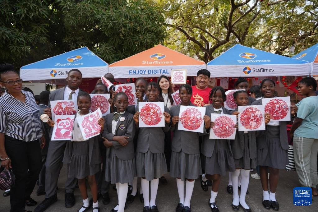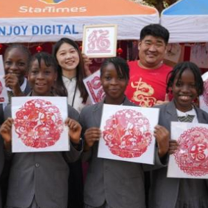 1月25日,在尼日利亚首都阿布贾的尼日利亚中国文化中心,人们手持中国剪纸作品在“欢乐春节”庙会上合影留念。