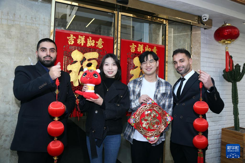 1月28日,在伊朗首都德黑兰,中国留学生与两名伊朗男孩一起展示蛇年主题装饰。