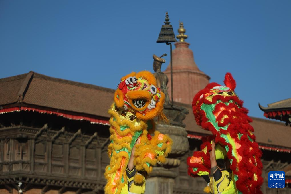 1月18日,在尼泊尔加德满都谷地的巴克塔普尔市,演员在2025尼泊尔旅游年暨中国新年系列庆祝活动启动仪式上表演舞狮。