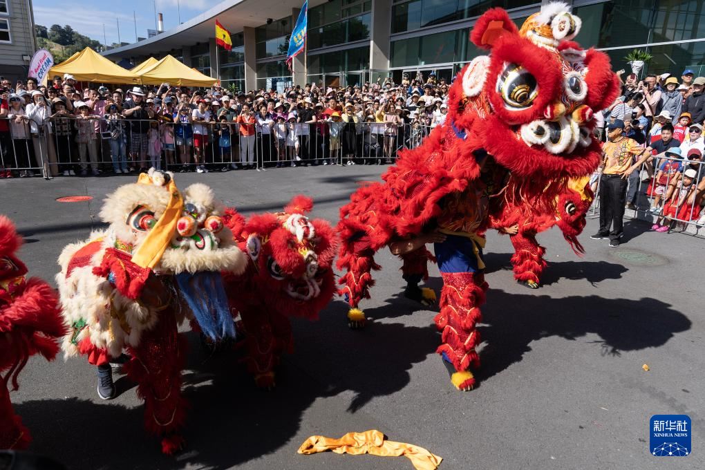 1月25日,在新西兰最大城市奥克兰,人们在2025蛇年“新春花市同乐日”活动现场观看舞狮表演。
