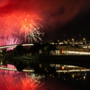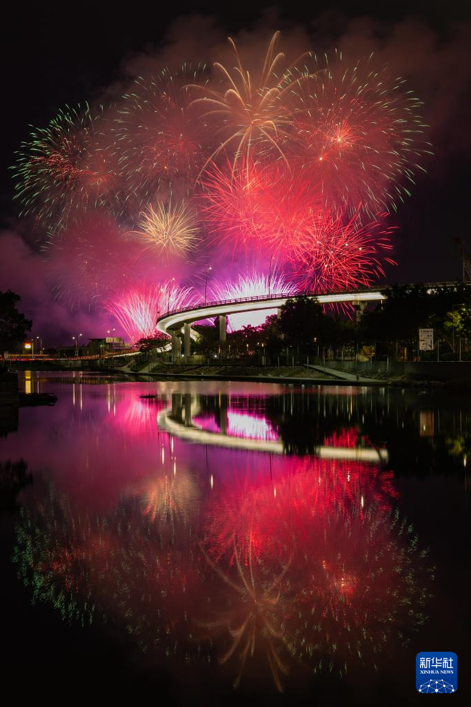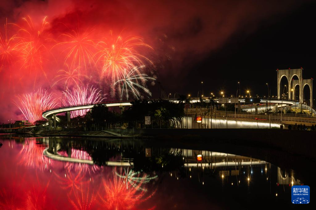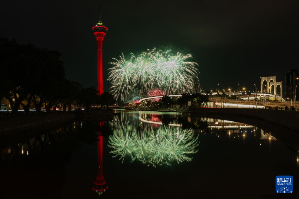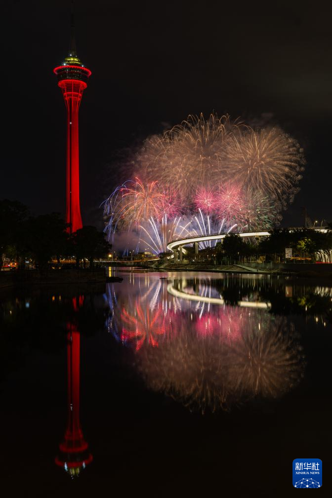 2月4日,澳门特区政府旅游局举行的“欢乐春节灵蛇献瑞烟花汇演”第二场在旅游塔对出海面绚丽绽放。