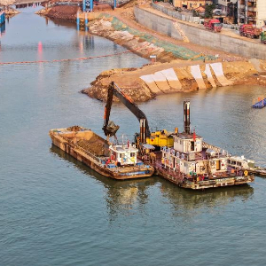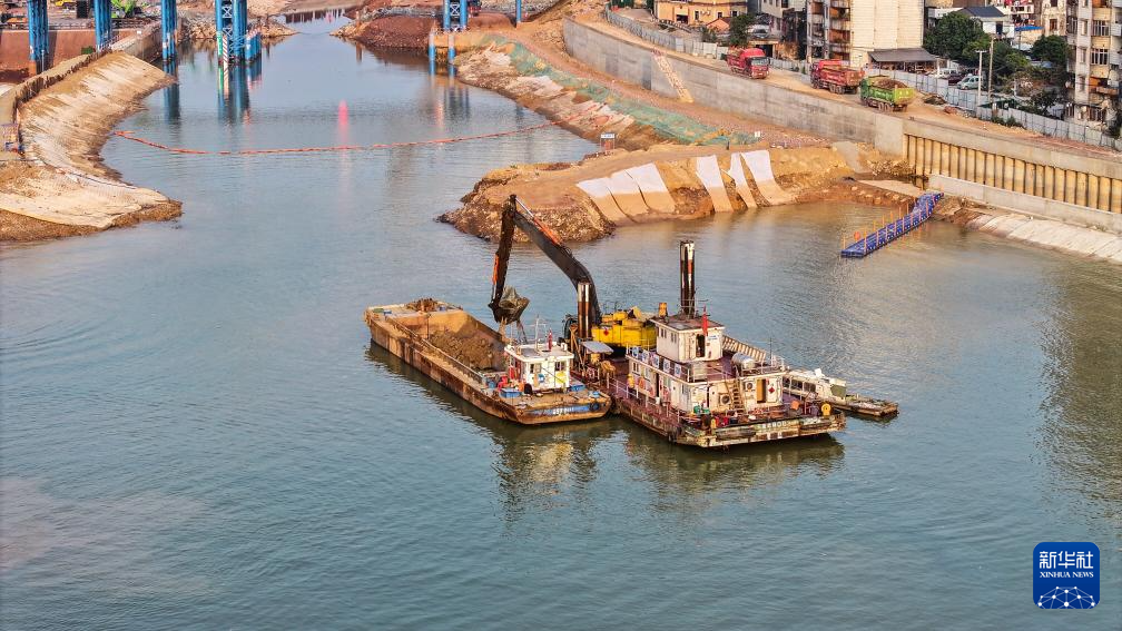 施工单位在疏浚平陆运河航道(2月4日摄,无人机照片)。