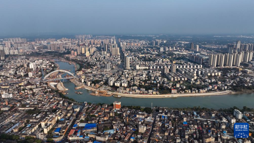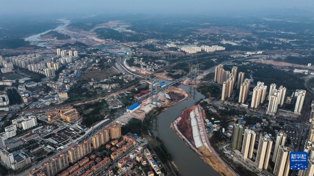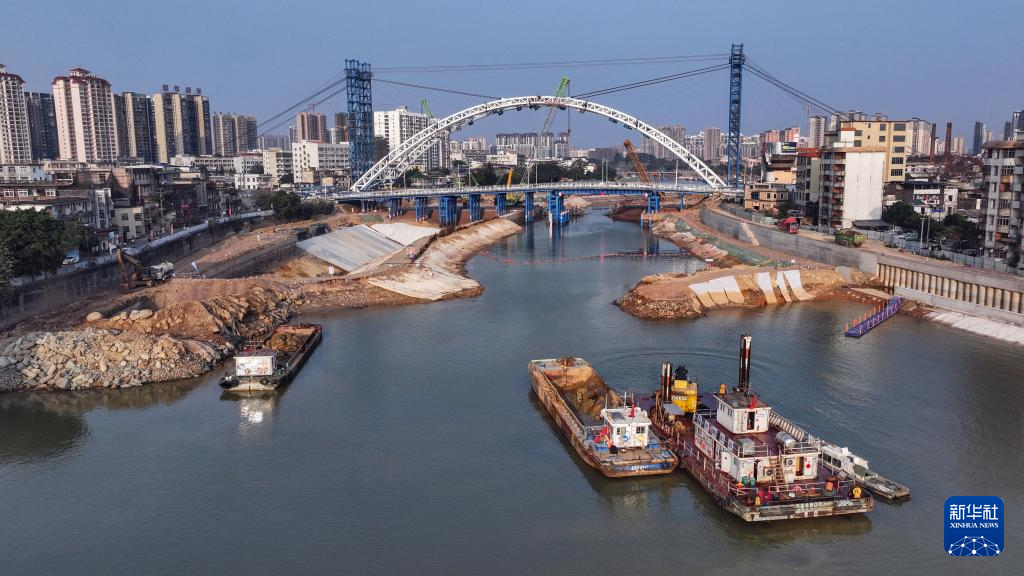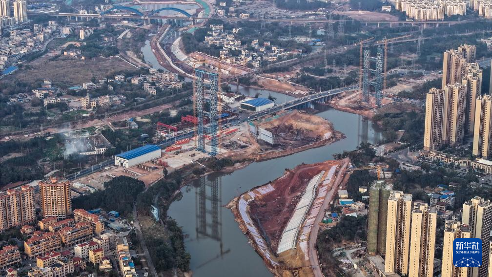 这是建设中的流经钦州市区的平陆运河(2月4日摄,无人机照片)。