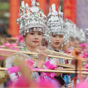 2月5日,苗族姑娘在融水苗族自治县杆洞乡百鸟衣芦笙坡会上进行民俗展演。