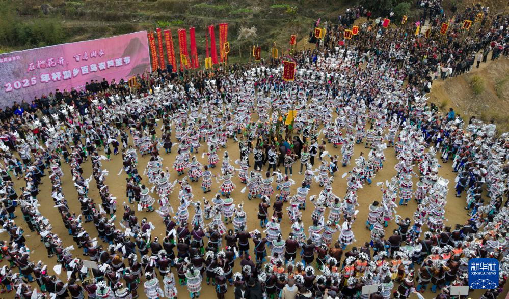 2月5日,在广西融水苗族自治县杆洞乡百鸟衣芦笙坡会上,各族群众一起跳芦笙踩堂舞(无人机照片)。