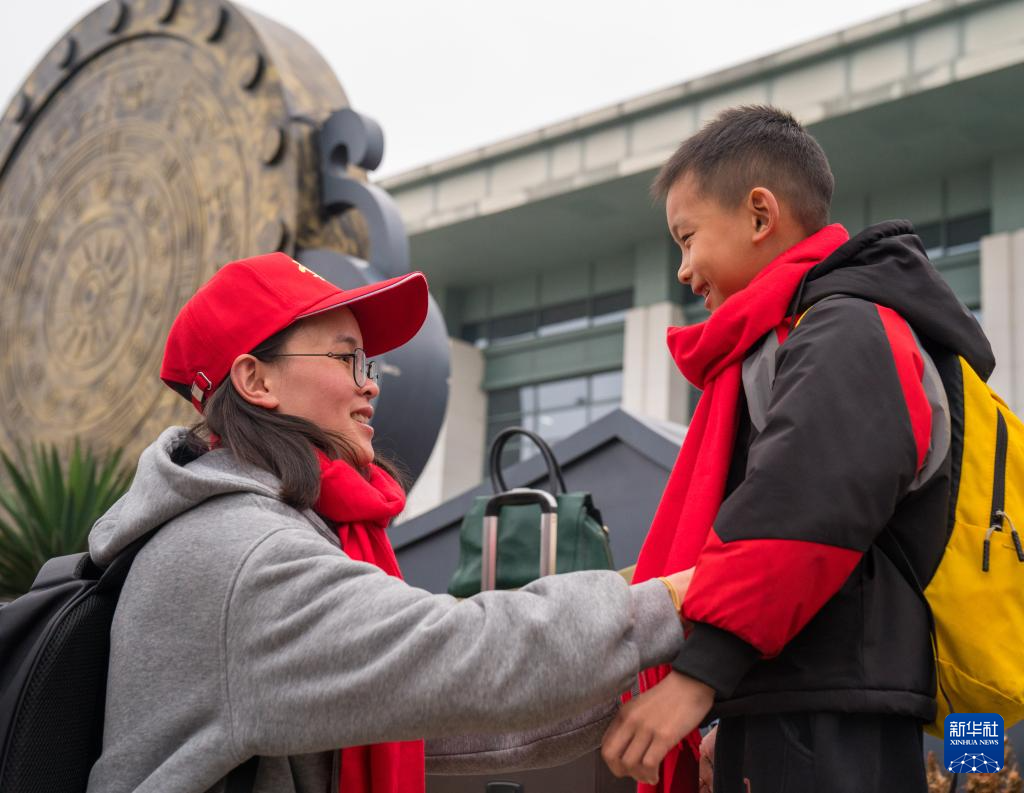2月5日,乘客在广南县站外为孩子整理衣物。