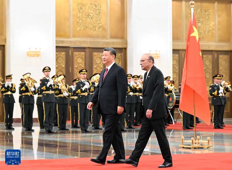 2月5日下午,国家主席习近平在北京人民大会堂同来华进行国事访问的巴基斯坦总统扎尔达里举行会谈。这是会谈前,习近平在人民大会堂北大厅为扎尔达里举行欢迎仪式。