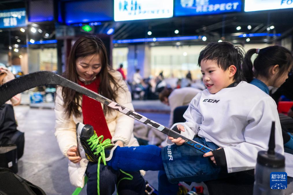 1月21日,小朋友在武汉市冰龙冰上运动中心学习冰球后更衣。