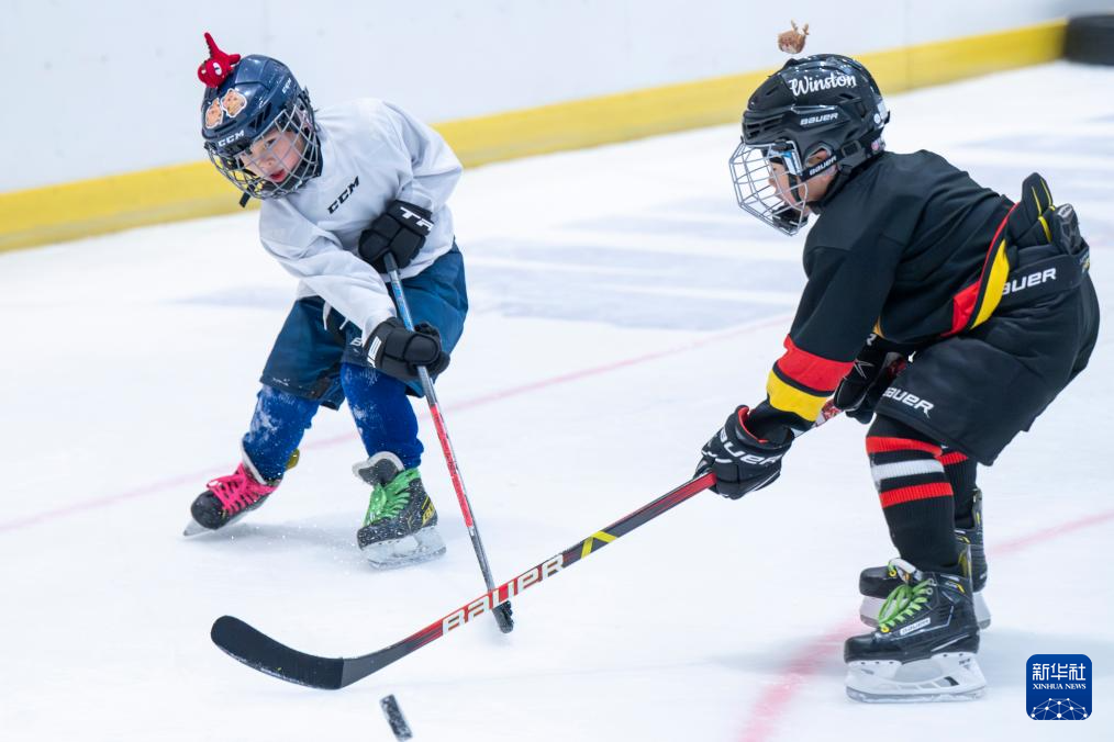 1月21日,小朋友在武汉市冰龙冰上运动中心学习冰球。