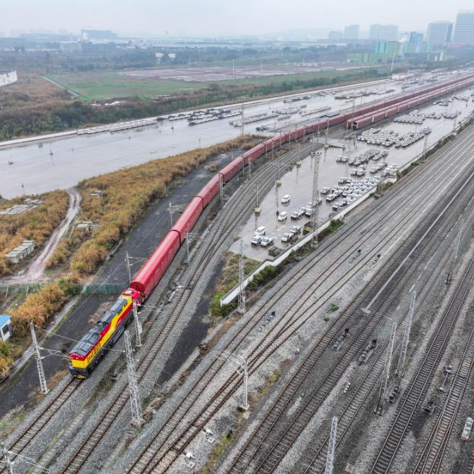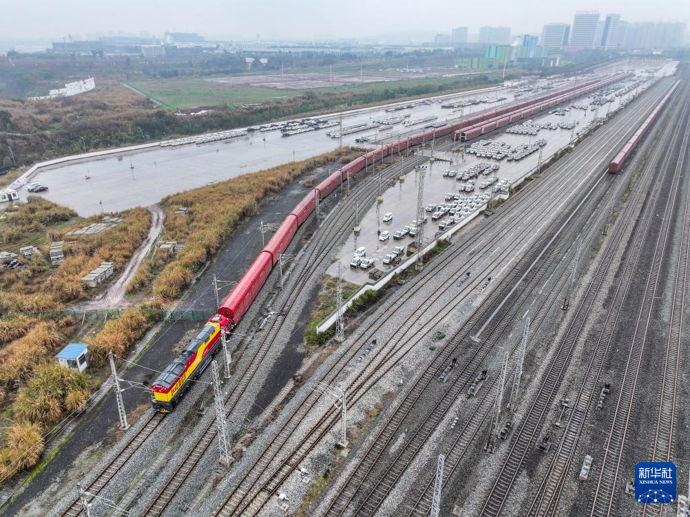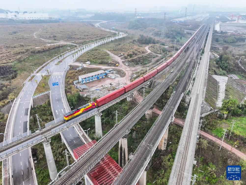 2月6日,“重庆造”整车专列在重庆鱼嘴站顺利发车(无人机照片)。