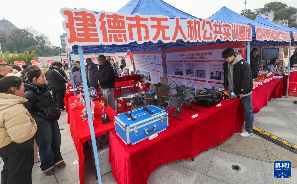 2月6日,在招聘会的建德市公共实训基地片区,工作人员在现场展示无人机设备及技术,应聘者可以现场报名参加实训基地培训,学习各类特色技能。