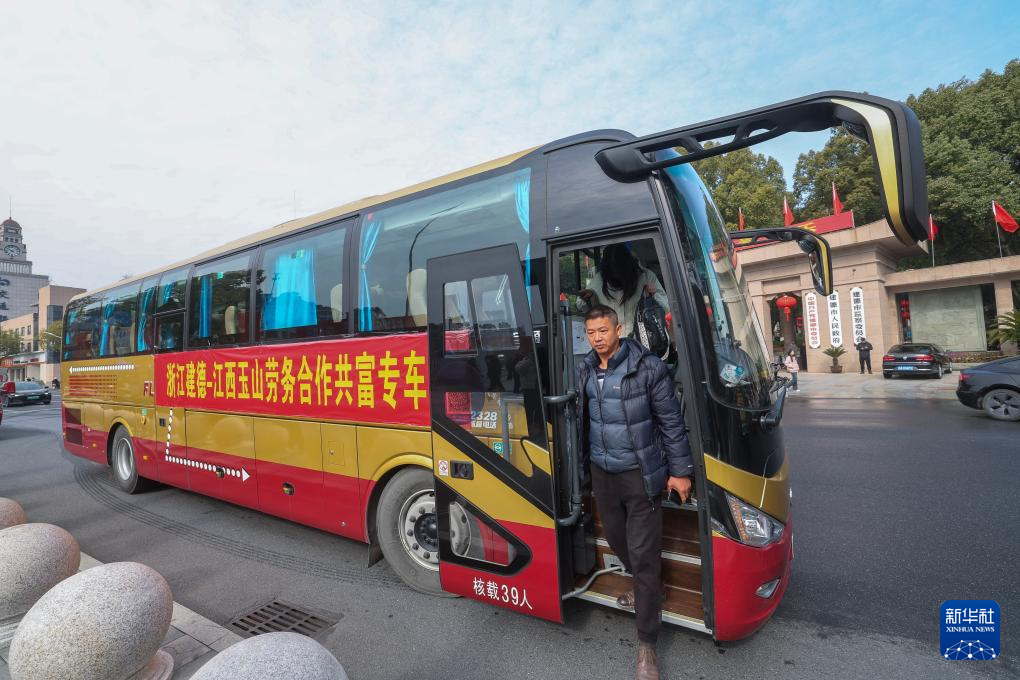 2月6日,来自江西的求职者搭乘劳务合作共富专车来建德新春招聘会现场求职。